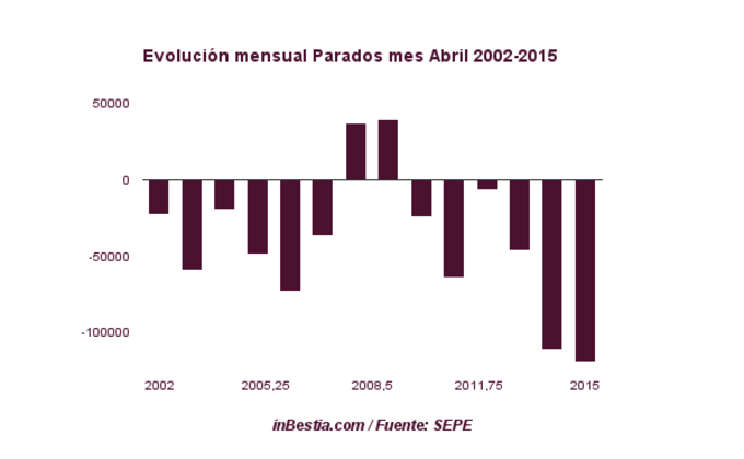 España: El Paro desciende en 118.923 personas Durante el pasado mes de abril el paro se redujo en 118.923 personas, la mejor cifra para un mes de abril -un mes en el que casi siempre se crea empleo- desde que comenzó... 5 de mayo, 2015