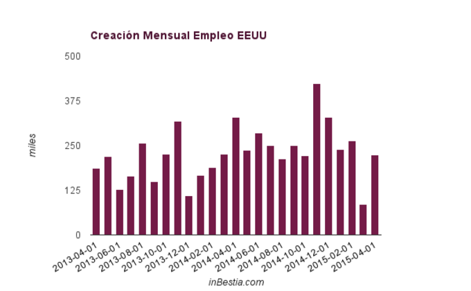 EEUU: +223.000 empleos Abril La economía norteamericana logró crear 223.000 empleos en el mes de abril, una cifra cerca a la esperada por el consenso y considerablemente mayor a los 85.000 empleos... 8 de mayo, 2015