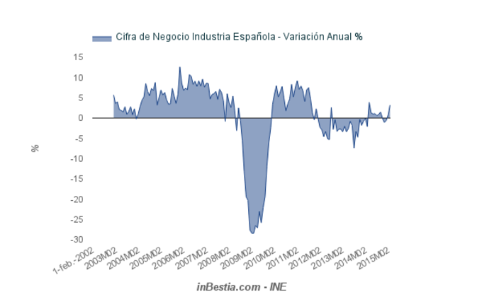 España: Sector Industrial +1,1% Marzo El sector industrial español creció en actividad económica un 1,1% en el mes de marzo. La evolución anual muestra un crecimiento del 3,2%, el más elevado desde abril de... 21 de mayo, 2015