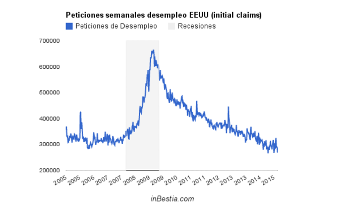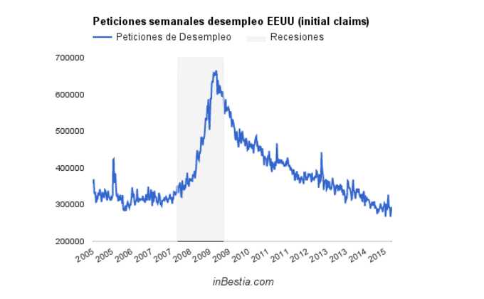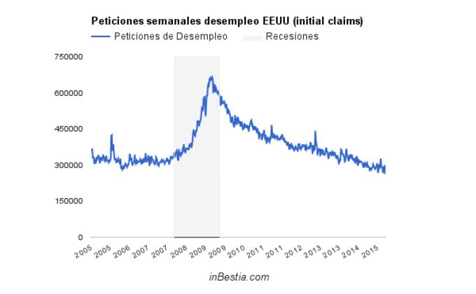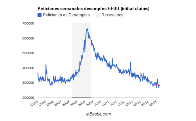 EEUU: Peticiones de Paro 262.000 El número de peticiones de paro alcanzó un nuevo mínimo cíclico (y de varia décadas) al solicitarse solamente 262.000 nueva peticiones de los seguros de desempleo... 30 de abril, 2015