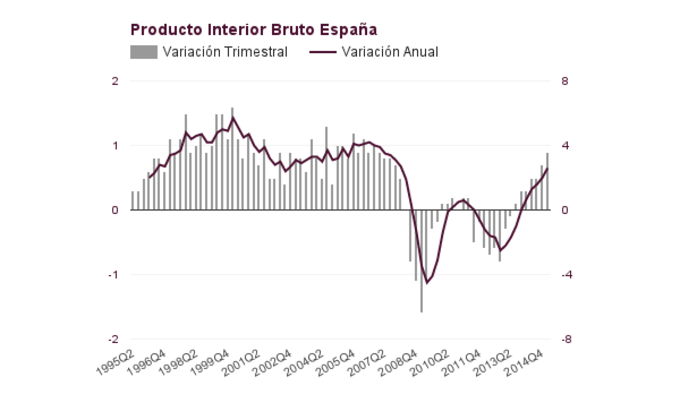España crece al mayor ritmo en 8 años, PIB 2,6% Fuerte dato de crecimiento del productor interior bruto español, el 2,6% en términos anuales y 0,9% trimestral.Se trata de trimestre de mayor crecimiento desde el... 30 de abril, 2015