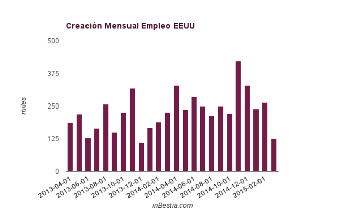 EEUU crea menos empleo de lo esperado, 126.000 Estados Unidos creó en el mes de marzo 126.000 empleos, notablemente menos de los 250.000 esperados por la media del consenso. Es la primera vez desde febrero de 2014 que... 3 de abril, 2015