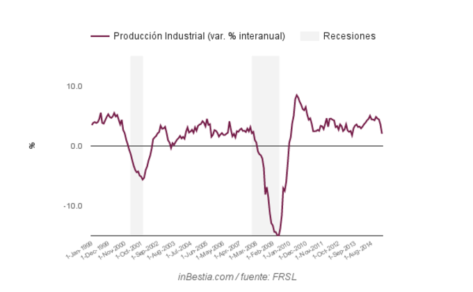 España: Producción Industrial La producción industrial española aumentó el 0,7% entre enero y febrero de 2015. Su crecimiento interanual es del 0,57%, positivo por tercer mes consecutivo. 10 de abril, 2015