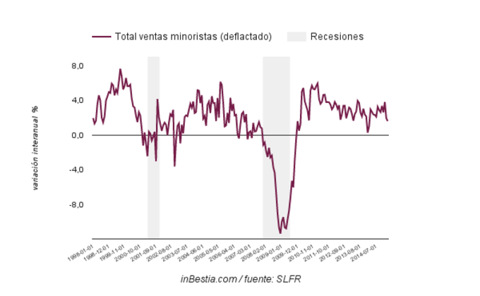 Eurozona: Ventas al por menor -0,2% Febrero Las ventas minoristas declinaron dos décimas en febrero con respecto al mes anterior, enero. No obstante, el crecimiento interanual sigue siendo sólido con un avance del... 8 de abril, 2015