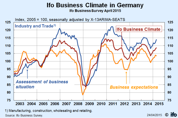 Alemania: IFO 108.6 abril El índice IFO sobre la situación empresarial en Alemania, subió en abril hasta los 108,6 puntos desde los 107,9 de marzo en lo que señala que la economía germana... 24 de abril, 2015