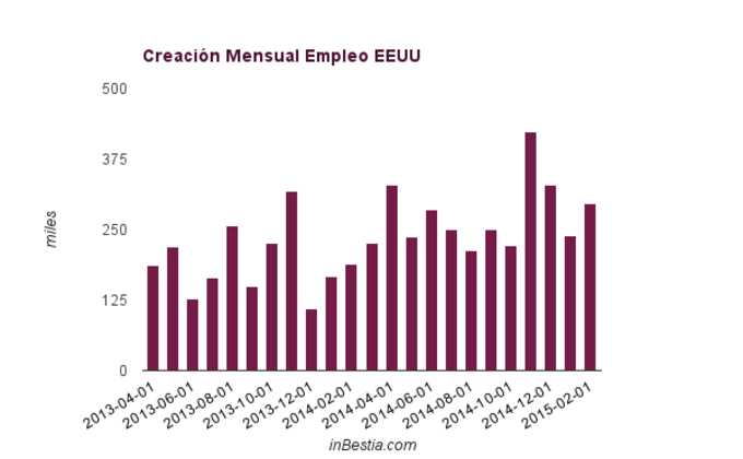 EEUU: +295.000 Empleos Febrero Durante el mes de febrero se crearon 295.000 en el conjunto de los sectores privados y públicos norteamericanos. Esta cifra es superior a los 240.000 esperados. 6 de marzo, 2015