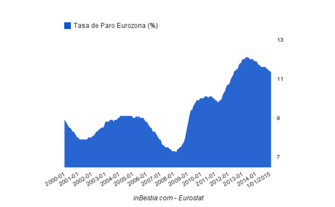 Eurozona: Tasa Paro 11,3% La tasa de paro en la Eurozona descendió en febrero una décima hasta el 11,3%. El máximo cíclico fue el 12,1% entre abril y junio de 2013. 31 de marzo, 2015