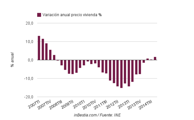 España: Precio Viviendas +1,8% El precio de la vivienda en España subió dos décimas entre el tercer trimestre de 2014 y el último. El crecimiento interanual, es decir doce meses, fue del 1,8%, el... 9 de marzo, 2015
