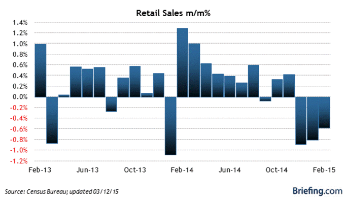 EEUU: Ventas Minoristas -0,6% Febrero Las ventas al por menor volvieron a descender en febrero seis décimas después de haber descendido ocho en enero. Se trata del tercer mes consecutivo de descensos en el... 12 de marzo, 2015