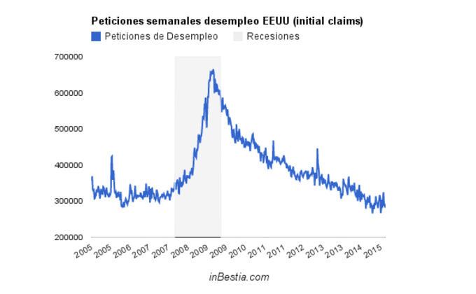 EEUU: Peticiones Paro 282.000 El número de nuevas solicitudes del seguro de desempleo disminuyó esta semana hasta las 282.000, una cifra un 15,06% inferior a la misma semana del año 2014. 26 de marzo, 2015