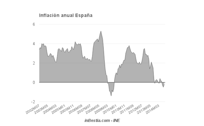 Inflación: los precios cayeron 0,2% en el último año Según datos difundidos hoy por el Instituto Nacional de Estadística, los precios en España continuaron su tercer mes consecutivo de contracción (-0,2%) pero lo hacen a... 29 de septiembre, 2014