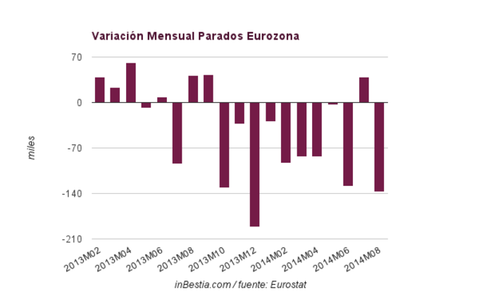 El paro desciende en 137.000 en la Eurozona El número de personas que salió de la situación de desempleo en el mes de agosto en la Eurozona alcanzó las 137.000, la segunda mejor cifra mensual desde el inicio de la... 30 de septiembre, 2014