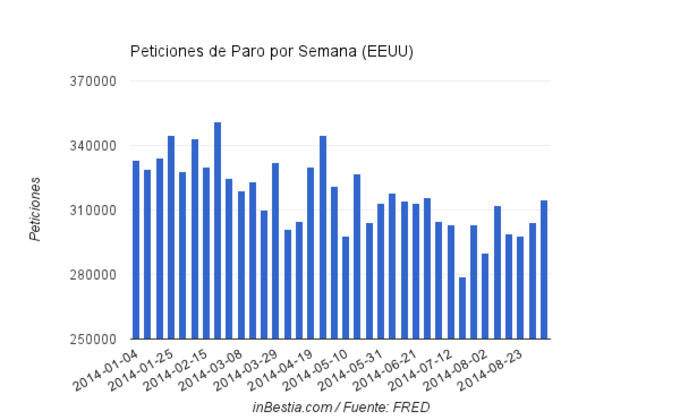 EEUU: 315.000 seguros de desempleo solicitados la pasada semana En la pasada semana 315.000 estadounidenses solicitaron el seguro de desempleo. Se trata de una cifra cerca de la media de los números vistos en este 2014 y solo un -0,94%... 11 de septiembre, 2014