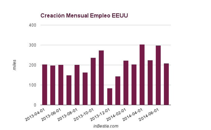 EEUU crea 209.000 empleos en julio, peor de lo esperado Según datos dados a conocer esta tarde la economía americana logró crear 209.000 empleos en el conjunto de los sectores público y privado. Esta cifra está por debajo de... 1 de agosto, 2014