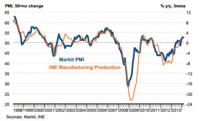 España PMI Sector Manuf. 52.8 Marzo Según publica hoy Markit Economics, el sector manufacturero creció en marzo en España y lo hizo a un mayor ritmo al haber pasado el índice PMI de los 52.5 puntos en... 1 de abril, 2014