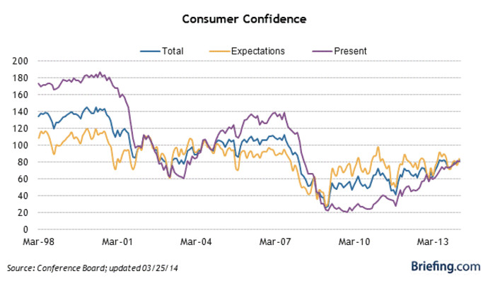 EEUU Confianza Consumidor 82.3 Marzo Sorpresa positiva en el índice de la Confianza del Consumidor elaborado por The Conference Board al reflejar un nivel de 82.3 en marzo, por encima de los 78.2... 25 de marzo, 2014