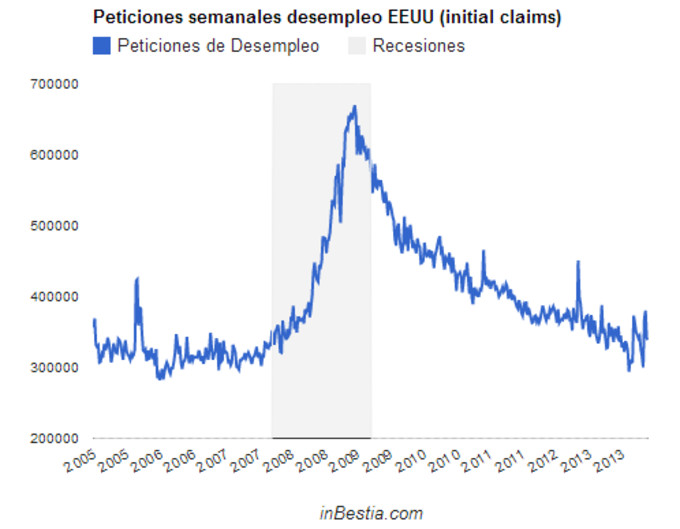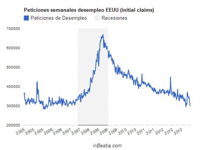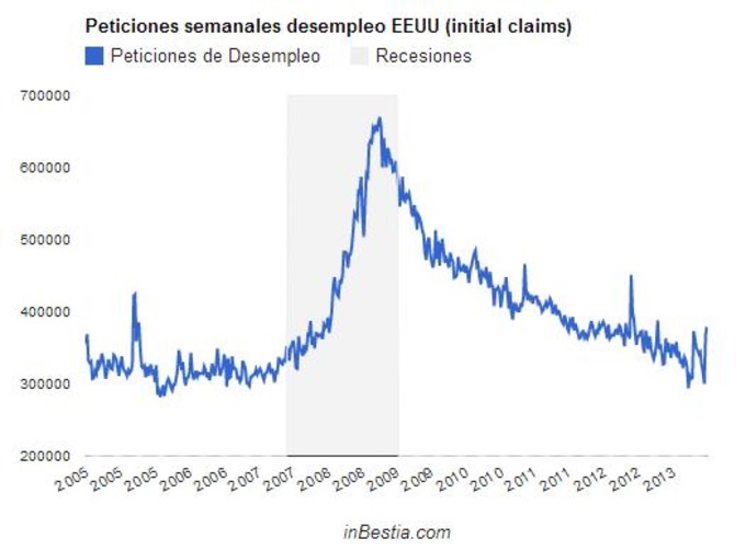 EEUU Peticiones Paro +298.000 (semana) En la última semana el número de peticiones del seguro de desempleo se redujo significativamente hasta las 298.000, cifra que se encuentra en el rango bajo del último... 5 de diciembre, 2013