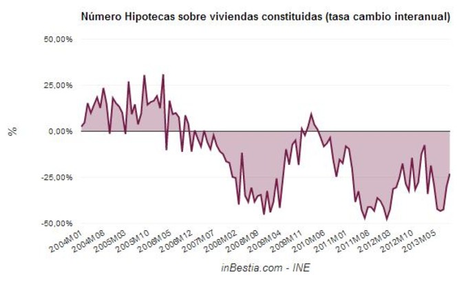 España Hipotecas Constituidas 14.704 octubre El número de hipotecas constituidas en octubre fue de 14.704, un -23.04% menos que hace un año. 20 de diciembre, 2013