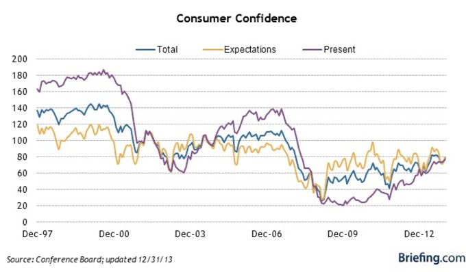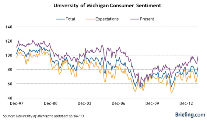 EEUU Sentimiento U. Michigan 82.5 Diciembre El índice de sentimiento de los consumidores elaborado por la Universidad de Michigan / Reuters Thompson refleja una lectura de 82.5 en diciembre, ascendiendo desde los... 24 de diciembre, 2013