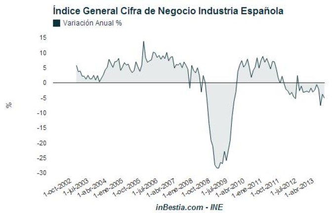 España Actividad Industrial -5,1% anual Según publica hoy el Instituto Nacional de Estadística, la cifra de negocio en la industria se contrajo hasta octubre un -5,1%. 19 de diciembre, 2013