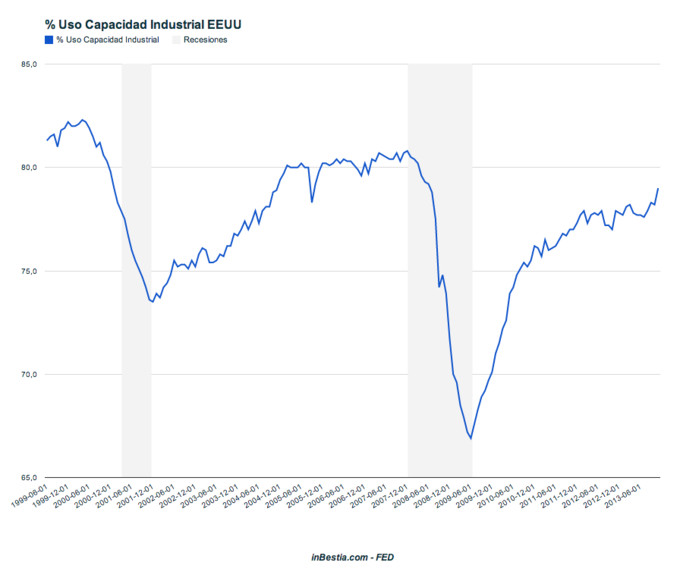 EEUU Uso Capacidad Industrial 79% Noviembre El uso del total de la capacidad industrial estadounidense ascendió en noviembre hasta el 79%, desde el 78.2 de octubre. Este nivel es el más alto conseguido por la... 16 de diciembre, 2013