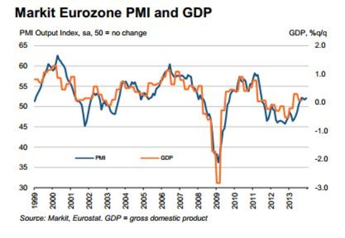 Eurozona Actividad Económica 52.1 PMI Compuesto Según Markit Economics, la actividad económica en la Eurozona se aceleró en diciembre con respecto a noviembre. El índice PMI Compuesto reflejó en el último mes del... 6 de enero, 2014