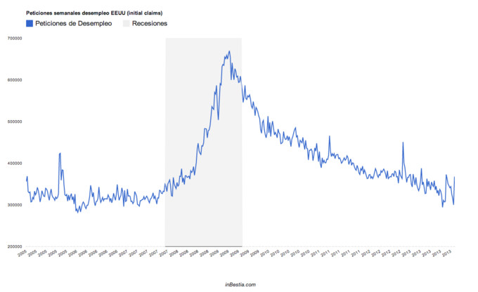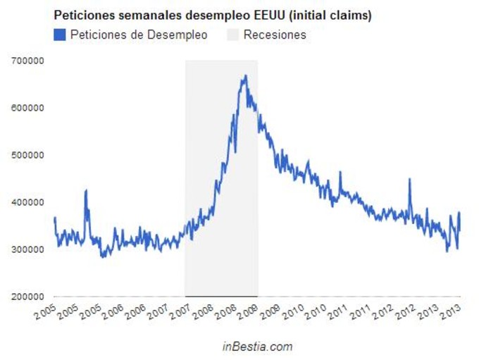 EEUU Peticiones Paro 368.000 Las peticiones semanales de los seguros de desempleo en EEUU aumentaron bruscamente la semana pasada hasta 368.000 desde los 300.000 de la semana previa. En los últimos... 12 de diciembre, 2013