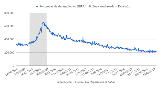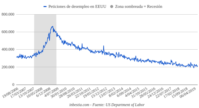EEUU: Peticiones de paro 206.000 Durante la pasada semana se solicitaron 208.000 nuevos seguros de desempleo en los Estados Unidos, una cifra muy cercana al dato revisado de la semana anterior de... 19 de septiembre, 2019