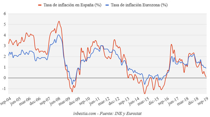 Datos adelantados de inflación en septiembre: España 0,1% y Eurozona 0,9% Según los datos provisionales de fuentes oficiales, la tasa de inflación en España descendió dos décimas en septiembre hasta el 0,1%, mientras que la zona euro... 2 de octubre, 2019