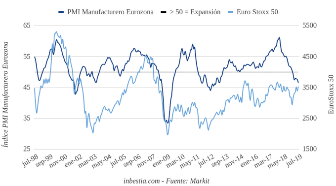 Eurozona: PMI Manufacturero 46,5 en julio El indicador de actividad industrial elaborado por Markit Economics para la zona euro ha revisado al alza una décima el dato adelantado de julio hasta 46,5,... 1 de agosto, 2019