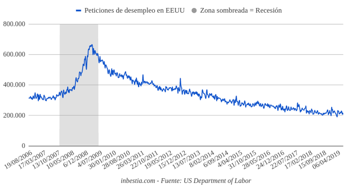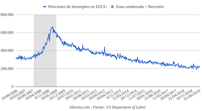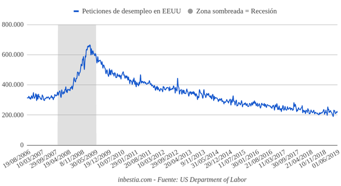 EEUU: Peticiones de paro 206.000 Durante la pasada semana se solicitaron 206.000 nuevos seguros de desempleo en los Estados Unidos, una cifra inferior al dato de anterior de 216.000. El indicador se ha... 25 de julio, 2019