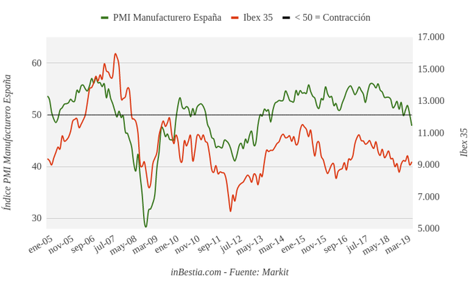 España: PMI Manufacturero 47,9 en junio El indicador de actividad industrial elaborado por Markit Economics ha establecido el dato de junio para España en el nivel de 47,9, claramente por debajo de la lectura del... 1 de julio, 2019