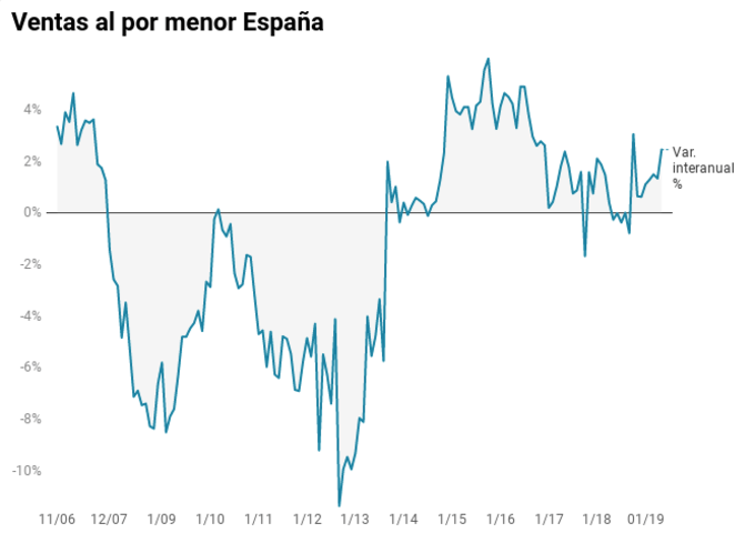España: ventas minoristas +0,7% en mayo Las ventas al por menor en España, según datos difundidos por el INE, repuntaron siete décimas en mayo con respecto al mes de abril y la evolución interanual -gráfico-... 28 de junio, 2019