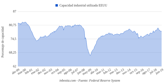 EEUU: Capacidad industrial utilizada 77,9% en junio Según la Reserva Federal, el porcentaje de capacidad industrial utilizada en junio fue del 77,9%, dos décimas menos que el dato revisado del mes anterior y una... 17 de julio, 2019