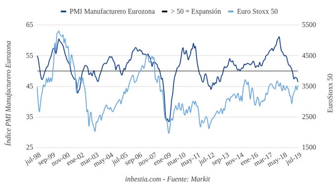 Eurozona: Flash PMI Manufacturero 46,4 en julio Según el dato adelantado de Markit, la actividad industrial en la zona euro siguió estancada en el último mes, pasando de 47,6 en junio a 46,4 en julio. Continúa la... 24 de julio, 2019