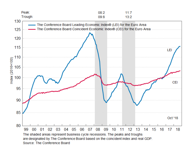 Eurozona: indicador líder +0,1% en octubre El indicador adelantado o líder de la zona del euro, indicador elaborado por The Conference Board, repuntó una décima en el mes de octubre hasta los 115,7 puntos. Se... 15 de noviembre, 2018
