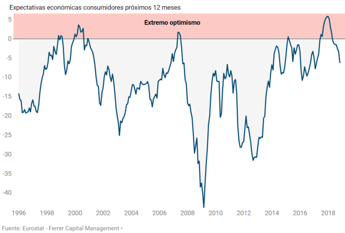 Eurozona: confianza consumidores -6,2 puntos en noviembre La confianza o expectativa a 12 meses vista de los consumidores europeos declinó fuertemente en este mes de noviembre hasta los -6,2 puntos desde los -3,3 puntos de... 29 de noviembre, 2018