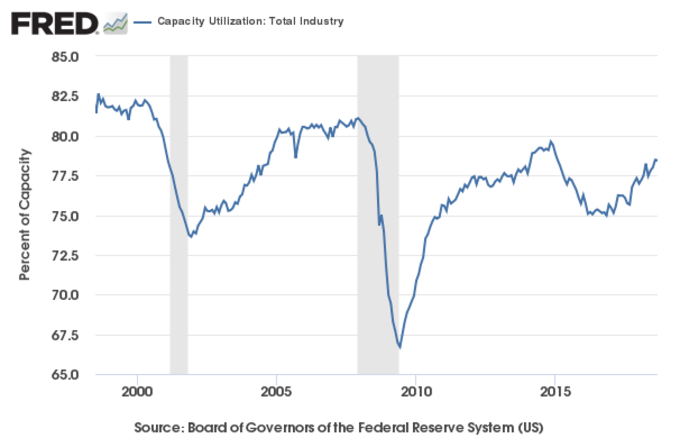 EEUU: uso capacidad industrial 78,4% El uso del total de la capacidad industrial de los Estados Unidos declinó una décima hasta el 78,4% en el mes de octubre. 16 de noviembre, 2018