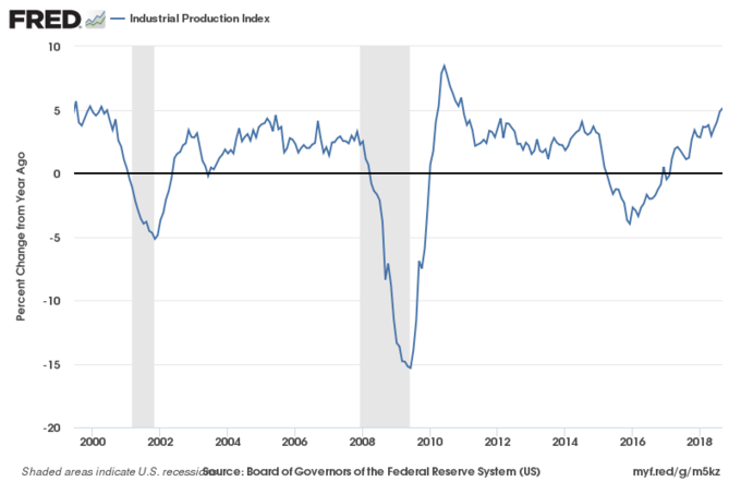 EEUU: producción industrial +4,1% anual El índice de producción industrial de los Estados Unidos, repuntó una décima en el mes de octubre con respecto a septiembre y crece el 4,1% anual. 16 de noviembre, 2018