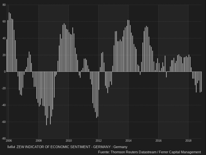 Alemania: índice ZEW -24,1 en noviembre El índice de confianza económica a seis meses vista (ZEW) sobre la economía alemana, una encuesta realizada entre 350 expertos financieros, registra una lectura negativa... 13 de noviembre, 2018