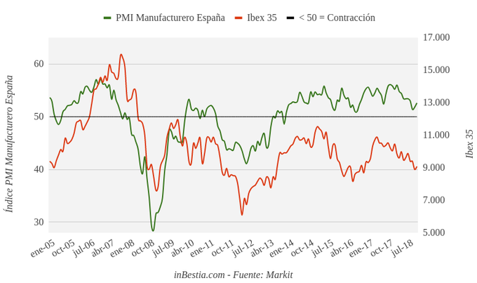 España: PMI Manufacturero 52,6 en noviembre El indicador de actividad industrial elaborado por Markit Economics ha establecido el dato de noviembre para España en el nivel de 52,6, ligeramente por encima de la... 3 de diciembre, 2018