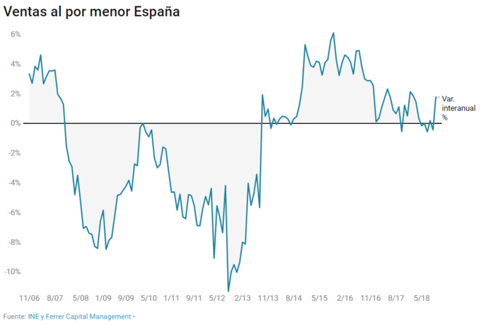 España: comercio minorista +1,8% anual hasta octubre Según datos difundidos esta mañana por el Instituto Nacional de Estadística (INE) español, el comercio al por menor repuntó nueve décimas en octubre sobre el mes de... 29 de noviembre, 2018