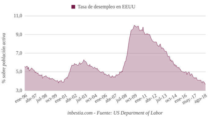 EEUU: Tasa de paro 3,7% en octubre Según los datos del Departamento de Trabajo de Estados Unidos, la tasa de paro se mantuvo en el 3,7% en octubre. El desempleo venía cayendo desde 2009 y la tendencia a la... 2 de noviembre, 2018