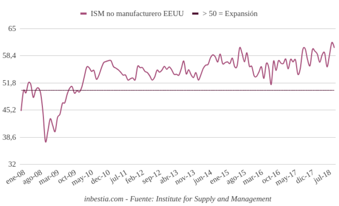 EEUU: Índice ISM no manufacturero 60,3 en octubre El índice elaborado por Institute for Supply Management (ISM) para el sector no manufacturero alcanzó en octubre el nivel de 60,3 un dato inferior al del mes anterior de... 5 de noviembre, 2018