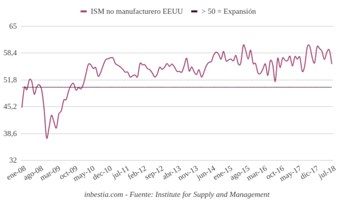 EEUU: Índice ISM no manufacturero 55,4 en julio El índice elaborado por Institute for Supply Management (ISM) para el sector no manufacturero alcanzó en junio el nivel de 55,4 un dato claramente inferior al del mes... 3 de agosto, 2018