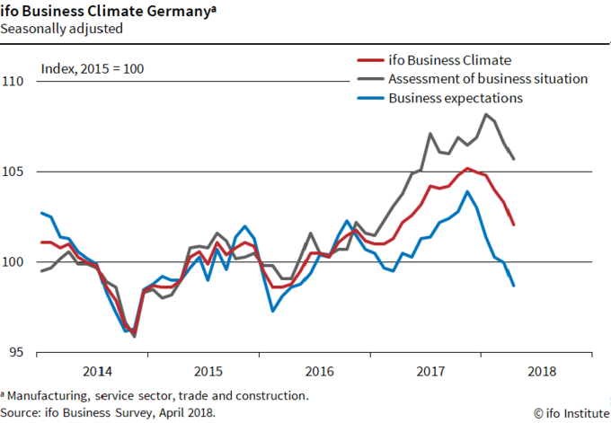 Alemania: IFO confianza empresarial cae a 102,1 puntos en abril El instituto IFO ha publicado hoy su indicador de confianza empresarial en la evolución económica del país germano, con otra caída más en este mes de abril hasta los... 24 de abril, 2018