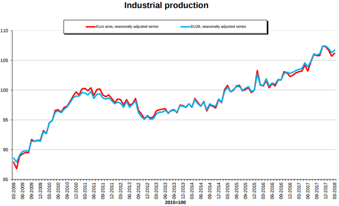 Eurozona: Producción industrial +3% interanual en marzo Según Eurostat, el índice de producción industrial en la zona euro aumentó un 0,5% en marzo con respecto al mes anterior y un 0,4% para el conjunto de la Unión Europea.... 15 de mayo, 2018
