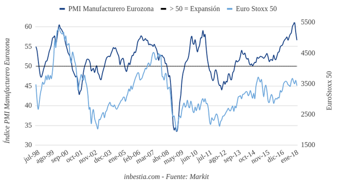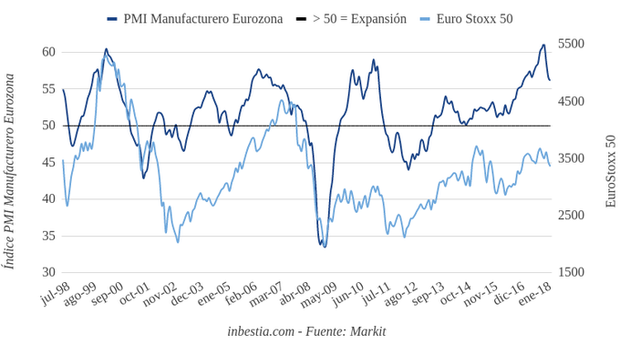 Eurozona: Flash PMI Manufacturero 56 en abril Según el dato adelantado de Markit, la actividad industrial en la zona euro redujo ligeramente su ritmo de expansión en el último mes, pasando de 56,6 en marzo a 56... 23 de abril, 2018
