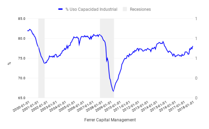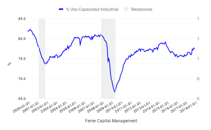 EEUU: 77,5% uso capacidad industrial instalada en enero El uso efectivo del total de la capacidad industrial instalada en los EEUU declinó hasta el 77,5% en enero, desde el 77,7% del mes anterior. 15 de febrero, 2018