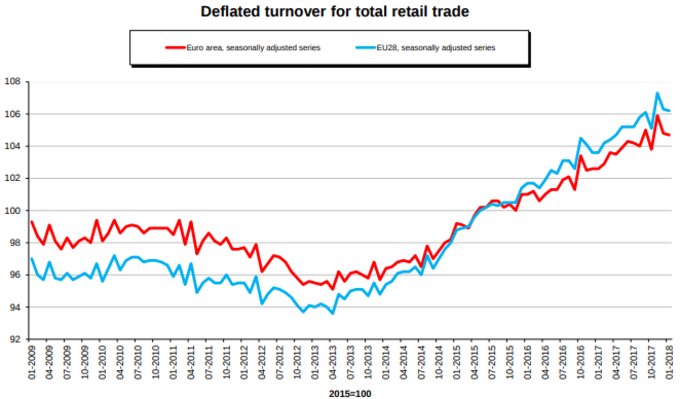 Eurozona: Índice de comercio al por menor +2,3% interanual en enero Según los datos procedentes de Eurostat, el volumen del comercio al por menor en la zona euro creció un 2,3% interanual en enero. El indicador se encuentra... 6 de marzo, 2018
